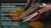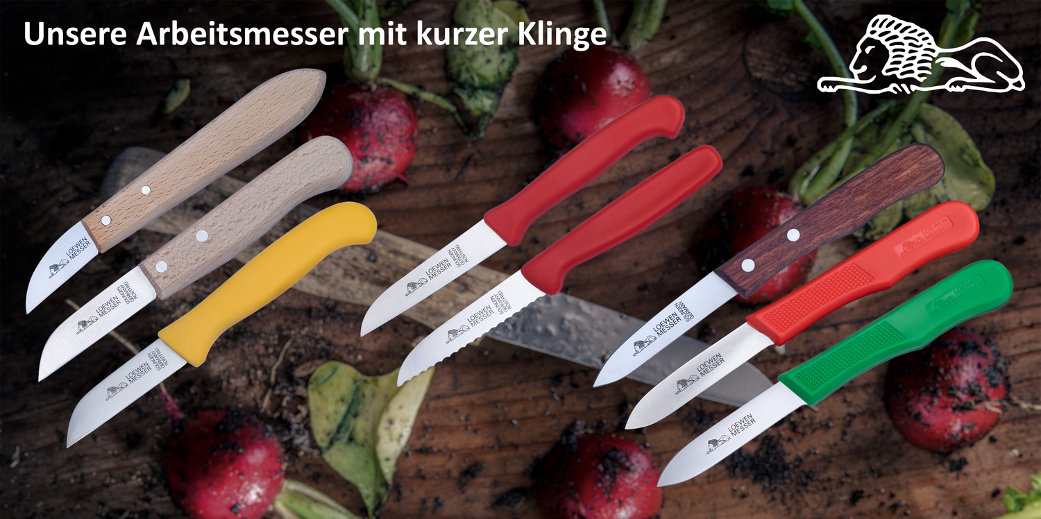 Die Klingen sind besonders dünn geschliffen, extrem scharf und lassen sich gut nachschärfen. Für die Griffe unserer „großen“ Arbeitsmesser verwenden wir hygienischen, besonders griffigen Kunststoff mit Gummianteil; die Messer lassen sich auch mit Handschuhen sicher greifen.