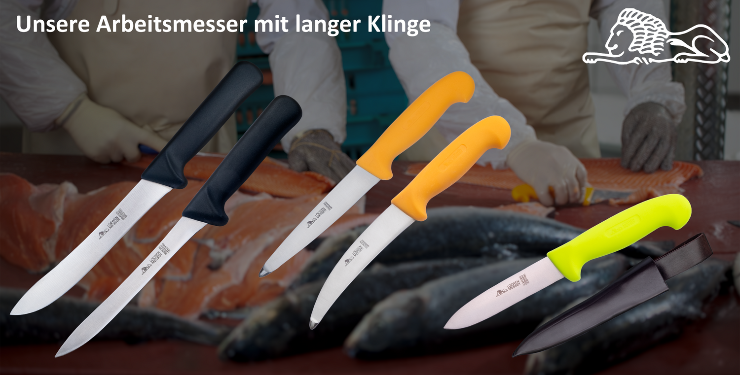 Unsere „großen“ Arbeits- oder Berufsmesser sind speziell für den professionellen Gebrauch optimiert, z.B. in der Fisch- oder Fleischverarbeitung.